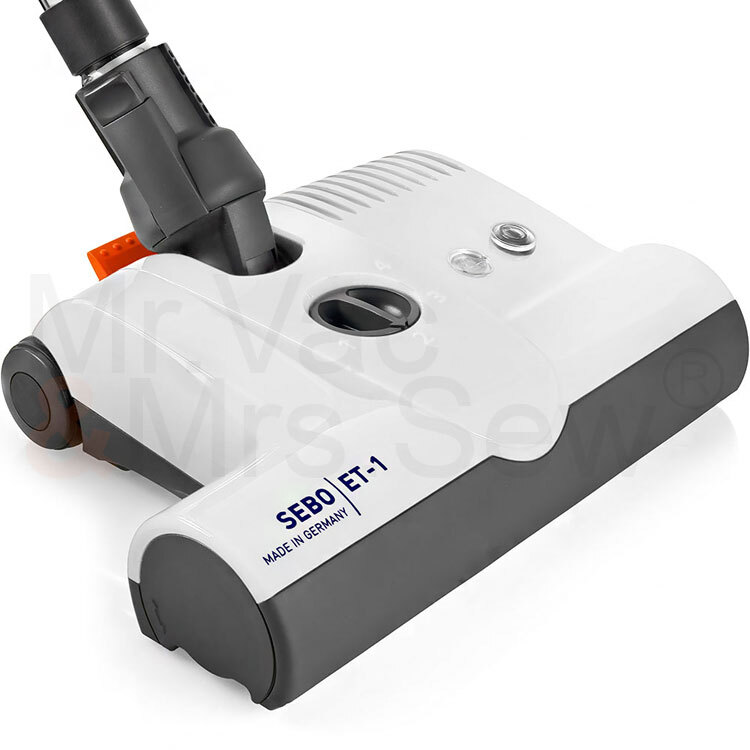 The SEBO AIRBELT E3 Premium Canister Vacuum includes the ET-1 Power Head for powerful carpet cleaning and safe bare-floor use when the brush is turned off. The ET-1 offers strong traction while still being easy to push. A built-in electronic overload automatically shuts the power head off if the brushroll is obstructed, preventing belt damage and motor strain. Stiff bristles deep clean carpets, while rubber wheels protect hard floors from scratching.