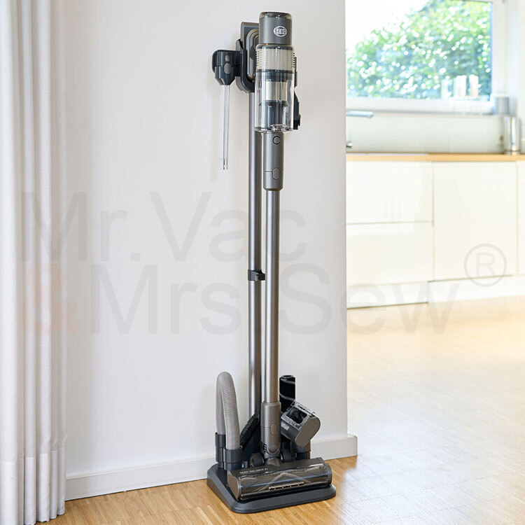 A compact charging station keeps the vacuum powered and accessories neatly organized, ensuring everything is ready when needed.